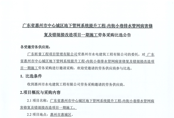 廣東省惠州市中心城區(qū)地下管網(wǎng)系統(tǒng)提升工程-內(nèi)街小巷排水管網(wǎng)病害修復及錯混接改造項目一期施工勞務(wù)采購(第二次)中選候選人公示……